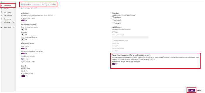 - Vérifiez que la fonctionnalité d’infrastructure du composant Power Apps pour l’application canevas doit être activée. Pour cela, vous devez accéder au gestionnaire d’environnement dans Centre d’administration Power Platform >environment->Seetings->features :